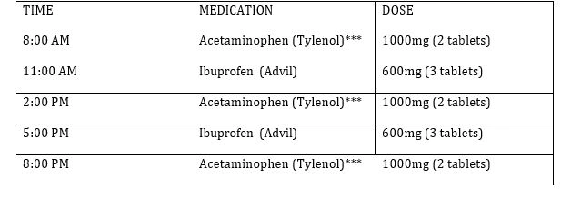 Pain: Alternate Ibuprofen (Advil) and Acetaminophen (Tylenol) every 3 hours for a minimum of 24 hours.